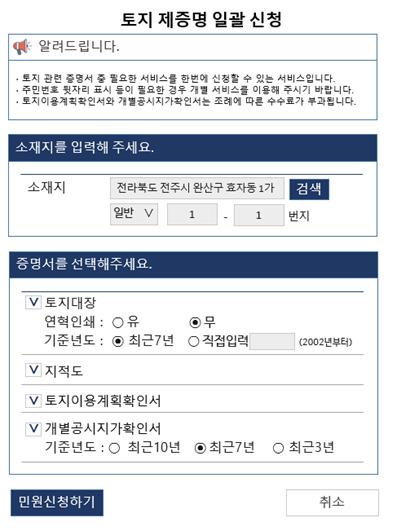 이번에 제공되는 ‘토지 제증명 일괄신청 서비스’는 토지 관련 민원사무를 한데 모아 보여주고 필요에 따라 원하는 증명서를 선택해서 한 번에 신청, 발급까지 받을 수 있는 서비스이다.