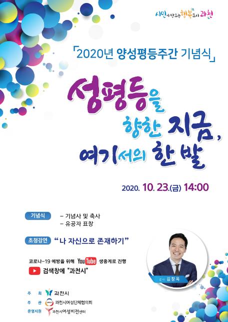 표창 수여식에 이어서는 김창옥 강사가 ‘나 자신으로 존재하기’라는 주제로 가족간의 양성평등에 대한 의미를 되새겨 볼 수 있는 내용의 강연을 한다. 강연은 유튜브를 통해 생중계되며, 해당 시간에 과천시 유튜브 채널에 접속하는 누구나 시청할 수 있다.