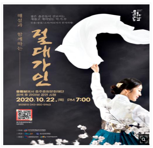 이번 ‘해설과 함께하는 절대가인’ 온라인 공연은 7월 샌드아트 뮤지컬 ‘한 아이’, 10월 국악단 소리개 길 Final Edition에 이은 3번째 공연으로 충주시는 2020년 방방곡곡 문화공감사업으로 4개 우수공연이 선정됐다.