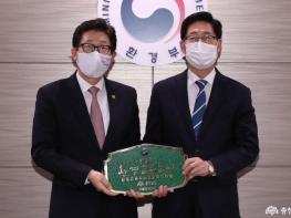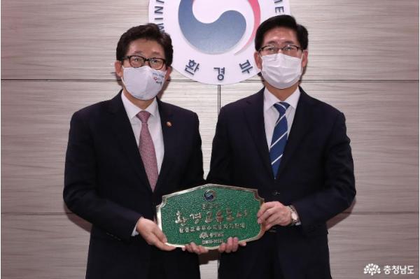 양승조 지사는 이날 환경부에서 개최한 환경교육도시 현판 전달식에 참석해 조명래 환경부 장관으로부터 환경교육도시 지정서와 현판을 전달 받았다.