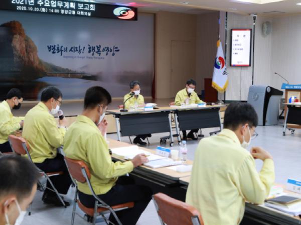 영양군은 10월 20일 영양군청 대회의실에서 군수, 부군수, 국과소장 및 주무담당 등 40여명이 참석한 가운데 내년도 주요사업계획 수립을 위한“2021년도 주요업무계획 보고회”를 개최했다.
