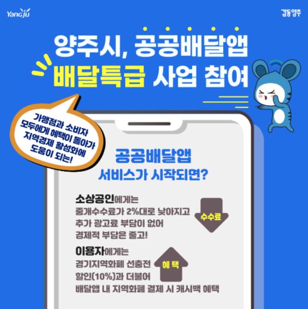 양주시는 코로나19 확산으로 인한 비대면 배달앱 사용 급증과 민간 배달앱 시장의 독과점 심화로 공공배달앱 필요성이 대두됨에 따라 경기도 공공배달앱 ‘배달특급’ 2차 확대 사업에 참여한다고 밝혔다.