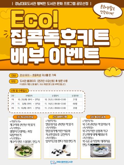 거제시립하청도서관은 사회적 거리두기가 장기화됨에 따라 피로감이 쌓인 학부모와 어린이를 위하여 가정 내 독서와 독서확장활동을 할 수 있는 『Eco! 집콕독후키트 배부 이벤트』를 오는 10월 31일부터 11월 21일까지 3회에 걸쳐 운영한다.