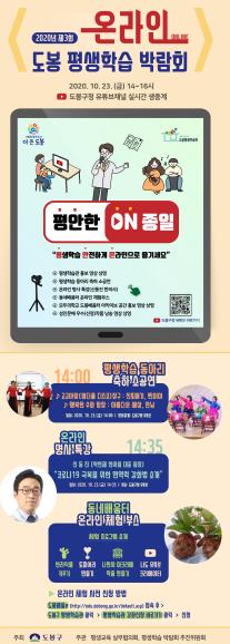 평생학습박람회는 ‘평안한 ON~종일, 평생학습! 안전하게 온라인으로 즐기세요’라는 슬로건 아래 10월 23일 오후 2시부터 4시까지 도봉구청 유튜브 도봉봉TV에서 실시간 라이브로 진행된다.