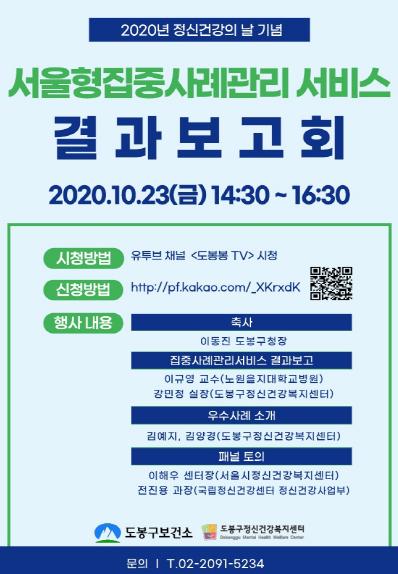 도봉구는 10월 23일 ‘2020 정신건강의 날’을 맞아 비대면 ‘서울형 집중사례관리서비스 결과보고회’를 개최한다.