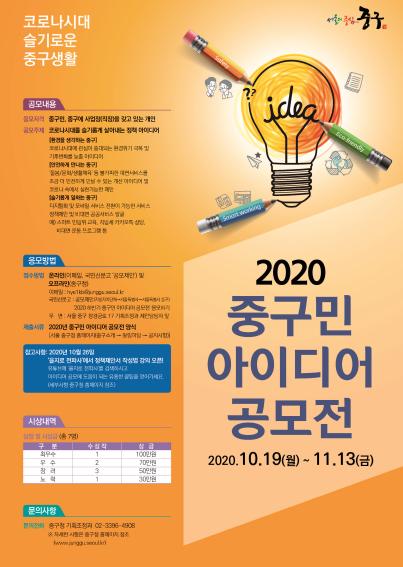 중구가 구민 참여에 기반한 창의적인 정책 아이디어를 발굴하고자 '2020년 중구민 아이디어 공모전'을 내달 13일(금)까지 개최한다.
