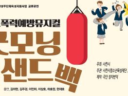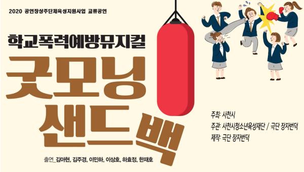 여성가족부 및 사천시에서 지원하고 사천시 청소년육성재단(이사장 최재원 부시장)이 운영하는 사천시 청소년상담복지센터는 사천시 문화예술단체 ‘장자번덕’과 함께 기획·제작한 학교폭력예방 뮤지컬 ‘굿모닝 샌드백’동영상 시청을 10월 20일부터 관내 초·중·고등학교를 대상으로 운영한다.