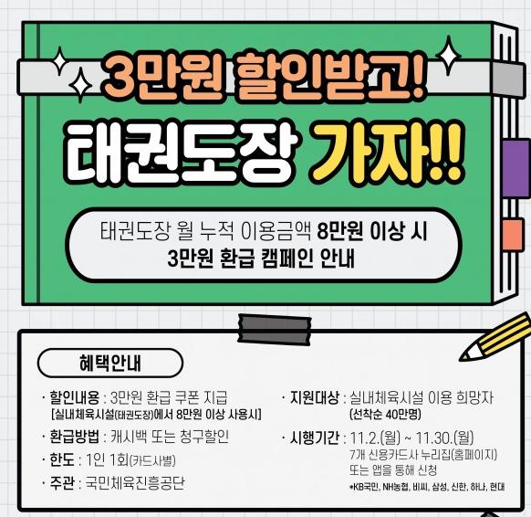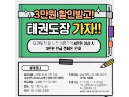 대한 태권도협회는 11.2일부터 11월30일까지 실내체육시설 할인소비쿠폰 발급 사업을 시행한다고 밝혔다.