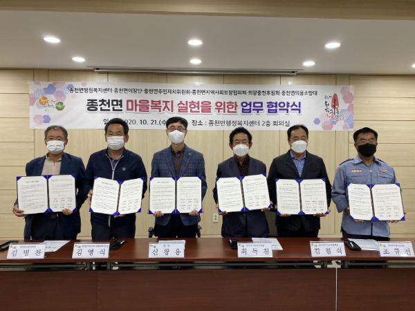 서천군 종천면은 지난 21일 종천면이장단협의회(회장 최득천), 종천면주민자치위원회, 종천면지역사회보장협의체, 희망종천후원회, 종천면의용소방대 등 지역 내 5개 단체와 종천면 마을복지 실현을 위한 업무 협약을 체결했다.