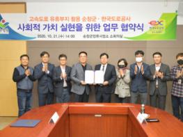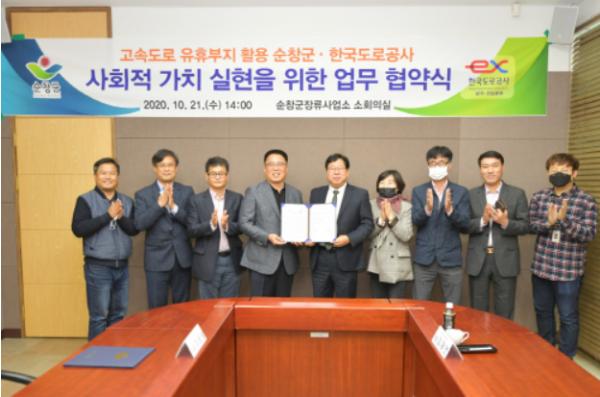 순창군이 지난 21일 순창장류연구소에서 한국도로공사와 강천산휴게소 주변 고속도로 유휴부지를 활용해 공용주차장과 폐비닐 집하장 조성을 위한 업무 협약을 체결했다.