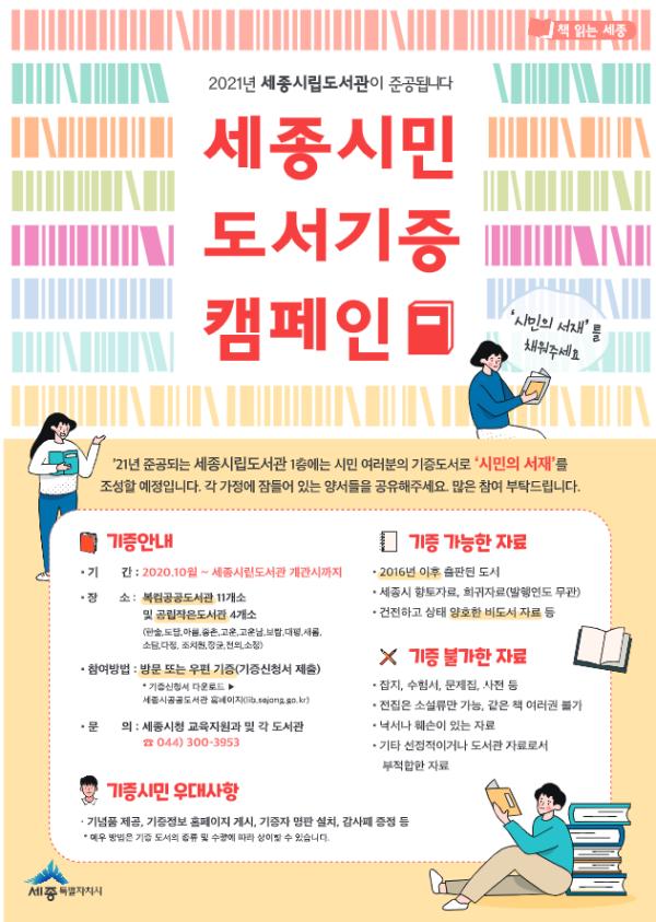 세종특별자치시가 내년에 개관하는 세종시립도서관 1층에 지역 커뮤니티 공간인 ‘시민의 서재’를 조성하기로 하고, 시민을 대상으로 도서 기증 캠페인을 펼친다.