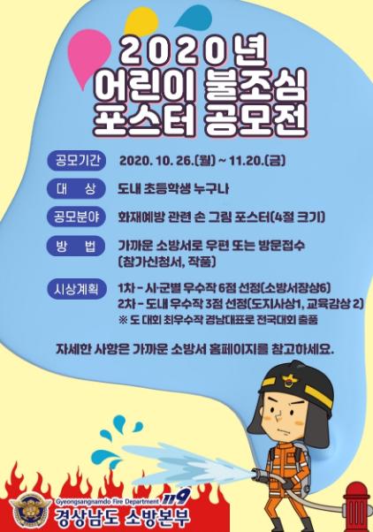 경남 소방본부가 ‘제73회 불조심 강조의 달’을 맞아 10월 26일부터 11월 20일까지 어린이 불조심 포스터 그리기 공모전을 개최한다.