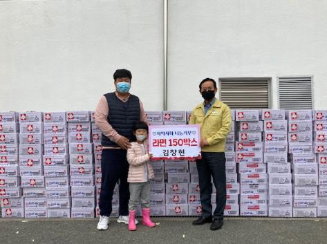 김창현 씨(32)는 10월 21일 군청을 방문하여 어려운 이웃들을 위해 라면 150박스를 기탁했다.