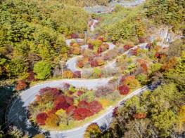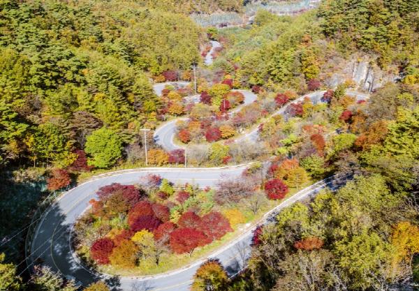 전망대에서 내려 보는 풍경은 구불구불 도로가 마치 오색단풍 속에 숨어 뱀이 똬리를 튼 듯 보이며, 그 절경이 한 폭의 그림 같아 탄식이 나올 정도다.