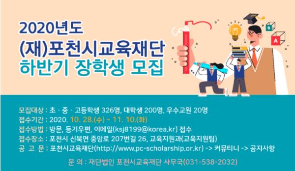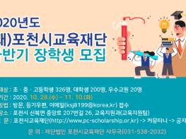 (재)포천시교육재단은 우수한 지역 인재를 발굴 육성하고 코로나19로 경제적 어려움에 처한 학생과 교육 발전을 위해 노력한 우수 교원을 지원하고자 2020년도 하반기 장학생과 우수교원을 선발한다고 밝혔다.