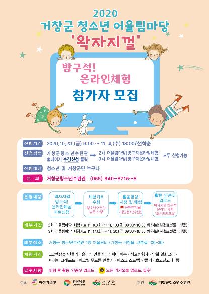 이번 온라인 체험에 참여를 희망하는 청소년이나 군민은 거창군청소년수련관 홈페이지를 통해 오는 10월 23일 오전 9시부터 11월 4일 오후 6시까지 선착순으로 신청 가능하다.