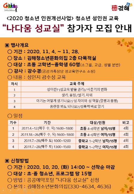 김해시는 내달 4일부터 28일까지 김해청소년문화의집에서 청소년인권개선사업의 일환으로 진행되는 ‘나다움 성교실’ 성인권 교육을 운영한다고 밝혔다.