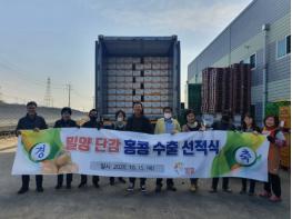 밀양시는 지난 10월 15일 1차 수출 선적식에 이어 21일 밀양시 상남면 소재 오공팜 선별장에서 단감 수출농가, 수출업체 등 10여명이 참석한 가운데 홍콩으로 2차 수출하는 선적식을 개최했다고 밝혔다.