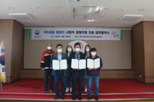 남부지방산림청 울진국유림관리소(소장 전상우)는 지난 20일 관리소 회의실에서 울진국유림영림단사회적협동조합, 주식회사 울진토염(예비사회적기업)과 ‘국유림을 활용한 사회적기업 지원 업무협약’을 체결하였다.
