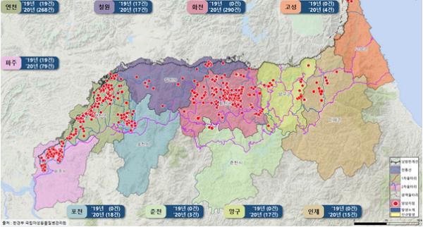 환경부는 지난 일주일간(10월 15일~21일) 멧돼지 시료 총 155건(폐사체 시료 41건, 포획개체 시료 114건)을 검사한 결과, 경기도 연천군과 강원도 양구군에서 발견된 폐사체에서 아프리카돼지열병 2건이 추가로 발생해 현재까지 총 766건이 발생했다고 밝혔다.