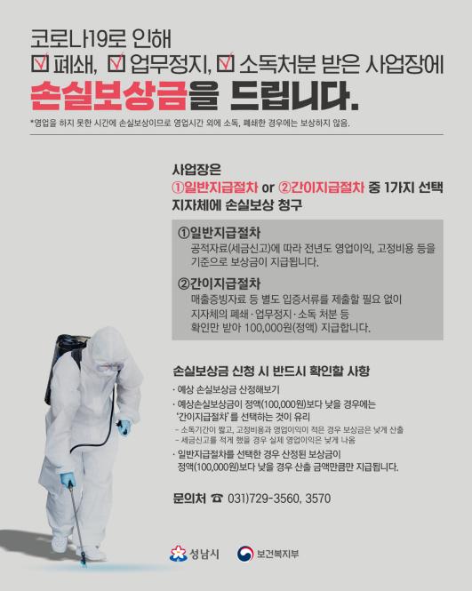 성남시는 코로나19 방역 과정에서 폐쇄되거나 업무 정지된 일반 영업장에 별도 보상금액 산정 절차 없이 손실보상금 10만원을 정액 지급한다.