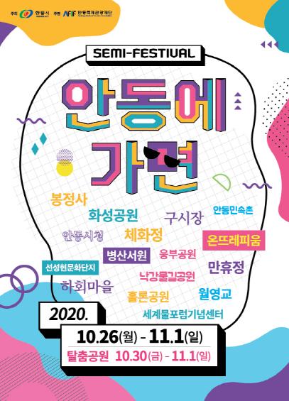 2020 특별기획 소규모 문화축제 「Semi-festival, 안동에 가면」이 10월 26일부터 11월 1일까지 7일간 지역주요 관광지 및 지역 문화 공간 일원에서 개최된다.
