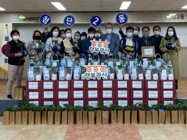 광산구 첨단2동 지역사회보장협의체가 22일 돌봄 이웃의 코로나19 우울증 극복 등을 위해 콩나물·반려식물 기르기 재료와 마스크가 담긴 총 320만원 상당의 ‘코로나 우울증 극복 꾸러미’를 전달했다.