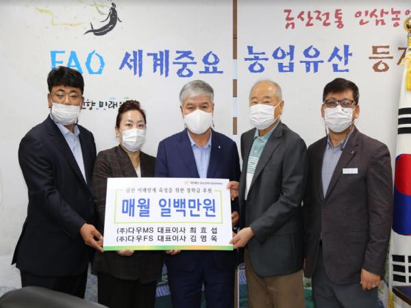 ㈜다우엠에스와 ㈜다우에프에스는 지난 22일 금산교육사랑장학재단에 장학후원금을 매달 100만 원씩 기탁하기로 결정했다.