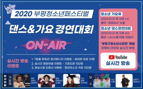 부평구 청소년수련관이 청소년의 끼와 재능을 발산하고 꿈을 이루는 발판이 되어 줄 ‘ON-AIR 부평청소년페스티벌’ 온라인 경연대회를 방송한다.