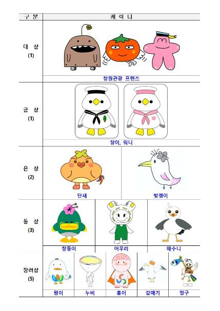 캐릭터 부문 대상은 아귀와 로봇을 합성해 만든 ‘아로’와 주남저수지의 철새와 단감을 합성해 만든 ‘감새’, 해군모자를 쓴 벚꽃을 의인화한 ‘버찐’등 귀여운 캐릭터로 다양한 매력을 발산한 ‘창원관광 프렌즈(김호영)’가 수상의 영광을 안았다.