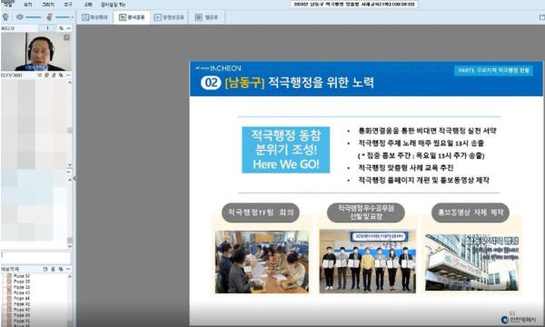 이번 적극행정 직무교육은 남동구 전 직원과 도시관리공단 적극행정 담당자를 대상으로, 내부 온라인 영상회의실을 통해 비대면으로 이뤄졌다.