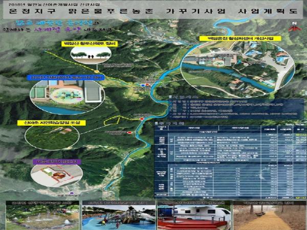 ?온정지구 맑은물 푸른농촌가꾸기사업?은 자연경관 및 역사문화 자원을 활용하고, 민간자본·전문인력 유치를 통한 기존사업 한계를 보완하며, 거점시설 연계 등 공간 디자인을 통해 생태복원, 활력 제고를 위해 추진하는 사업이다.