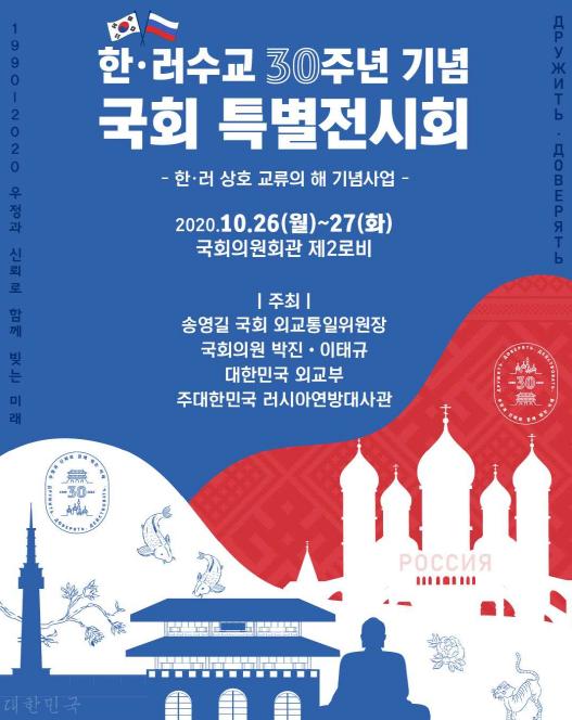 외교부는 한-러 수교 30주년을 기념하여 송영길 국회 외교통일위원장, 박진 국민의힘 국회의원, 이태규 국민의당 국회의원, 주한러시아대사관 등과 함께 ‘한-러 수교 30주년 기념 국회 특별전시회’를 10.26일부터 27일까지 국회의원회관에서 공동 개최한다.