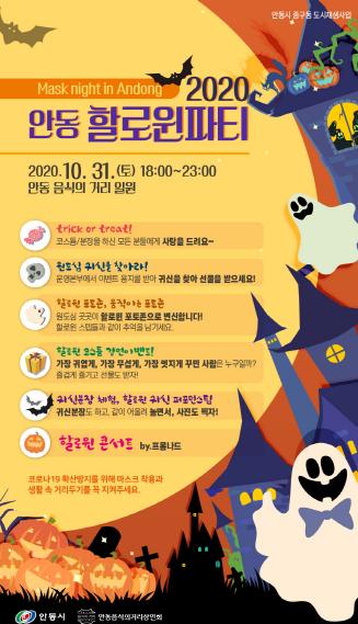 안동 원도심 상권 활성화를 위한‘2020 웅부객주거리 로드 페스티벌’및 ‘2020 할로윈파티’가 오는 10월 30일(금)부터 31일(토)까지 이틀간 음식·문화의 거리 일원에서 개최된다.