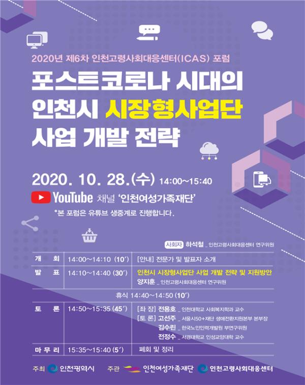 인천고령사회대응센터는 오는 28일 ‘포스터코로나 시대의 인천시 시장형사업단 사업 개발 전략’이라는 주제로 2020년 제6차 ICAS 포럼을 개최할 예정이다.