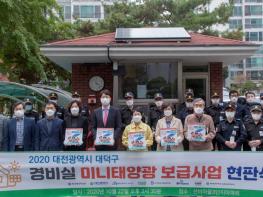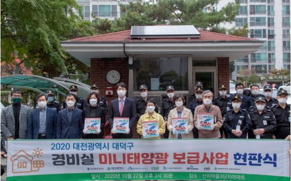 대전 대덕구는 재생에너지의날을 맞아 지난 22일 송촌동 선비마을3단지 관리사무소 앞에서 기후위기 대응 및 미니태양광 보급 활성화를 위한 ‘공동주택 경비실 미니태양광 보급사업’현판식을 가졌다.