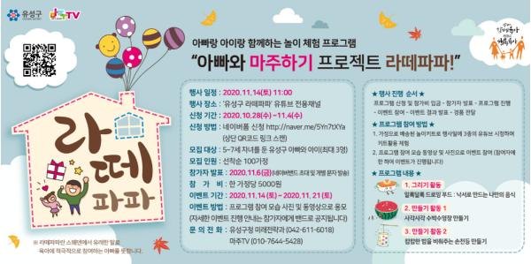 대전 유성구는 바람직한 육아 문화 조성을 위해 11월 14일 ‘라떼파파 프로그램’을 온라인으로 개최하고, 운영에 앞서 이달 28일부터 내달 4일까지 선착순 100가족을 모집한다고 25일 밝혔다.