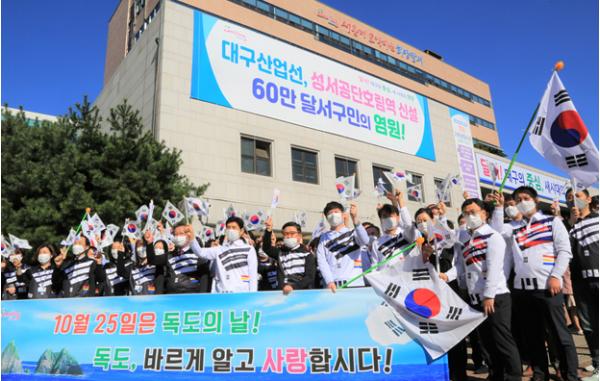 대구 달서구(구청장 이태훈)는 10월 23일 오전 10시 구청 광장에서 100여명의 직원들이 독도티셔츠를 착용하고 독도에 대한 관심과 애국심 제고를 위해 ‘독도의 날 홍보 캠페인’을 펼쳤다.