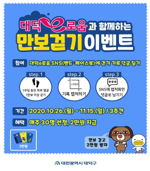 대전 대덕구는 26일부터 11월 15일까지 3주간 코로나19로 인한 사회적 피로감 해소와 시민 건강증진을 위해 ‘만보걷기’ 대덕e로움 사용자 SNS이벤트를 진행한다.