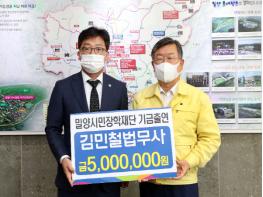 (재)밀양시민장학재단(이사장 박일호)은 밀양시 내이동에 소재하고 있는 김민철 법무사사무소(대표 김민철)에서 지역우수인재 양성과 밀양지역 명문학교 육성지원을 위한 장학기금으로 5백만 원을 전달해 왔다고 26일 밝혔다.
