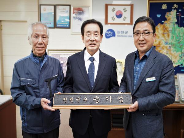 명패는 진천군 산림바이오매스 산물수집단에서 근무 중인 김영규(68세)씨의 재능기부로 제작됐으며 군수, 부군수를 비롯한 간부공무원 및 군의원 47명에게 전달됐다.