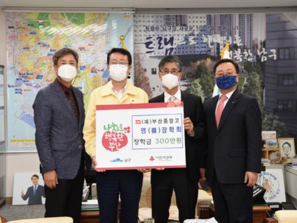 부산시 남구는 (재)부산중앙고 영(嶺)장학회에서 10월 21일 작년에 이어 올해도 장학금 300만원을 기탁했다고 밝혔다.