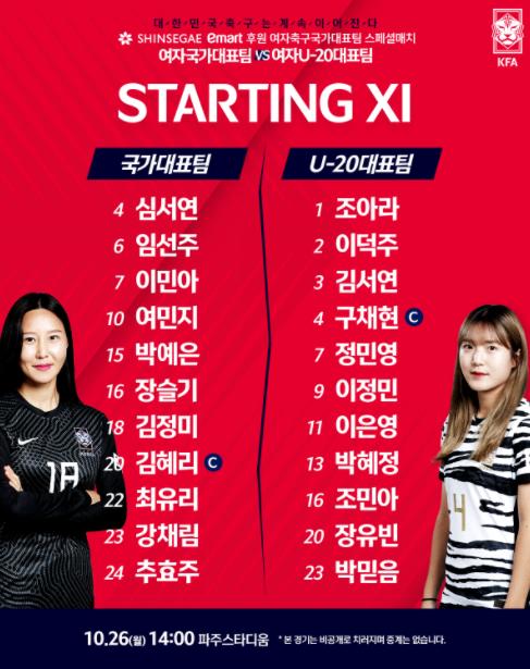 허정재 감독의 선발 명단에는 큰 변화가 있었다. 1차전과 비교해 8명이 바뀌었다. 장유빈(대전대덕대)과 이은영(울산현대고)이 투톱으로 나서고 그 밑에는 이정민(경북위덕대), 정민영(세종고려대), 박혜정(세종고려대), 박믿음(경북위덕대)이 선다. 수비는 이덕주(강원도립대), 구채현(세종고려대), 김서연(세종고려대), 조민아(울산과학대)가 맡고, 골키퍼 장갑은 조아라(강원도립대)이 낀다.
