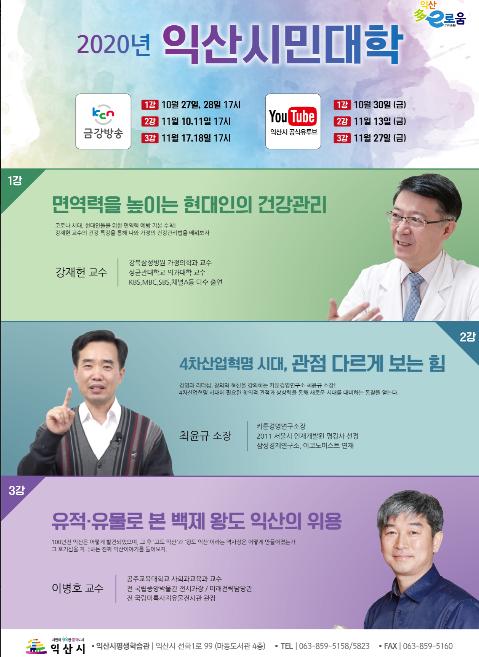 특히 올해는 코로나19 감염병 예방 및 지역감염 확산을 막기 위해 모든 강좌가 비대면으로 녹화되며 KCN 금강방송과 익산시 공식 유튜브 채널을 통해 방송된다.