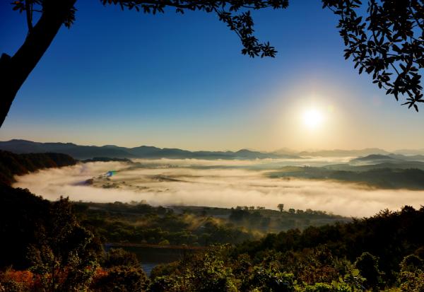 요즘 낮과 밤의 기온차가 심한 새벽녘에는 낮게 깔린 구름은 춤을 추듯 일렁이고 굽이쳐 흐르는 남강에서 올라오는 물안개 속을 뚫고 떠오르는 붉은 태양과 빛내림은 흡사 수묵화를 연상케하여 보는 이들에게 탄성을 자아내게 하고 있다.