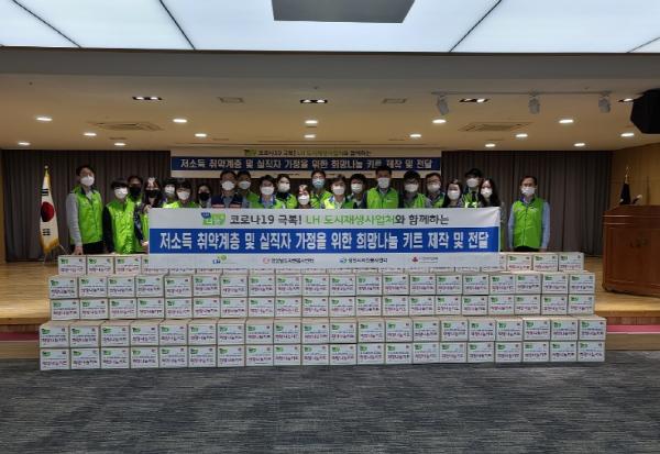 LH 도시재생사업처 임직원 30명이 직접 제작한 응원메세지 카드와 식료품 11종으로 구성된 ‘희망나눔 키트’는 이날 창원시자원봉사센터를 통해 창원시 관내 긴급지원이 필요한 200세대에 전달될 예정이다.