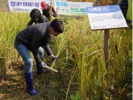 이날 행사는 벼 베기와 탈곡 체험, 직접 수확한 벼이삭으로 기념품 만들기로 구성됐고, 코로나19 확산 방지를 위해 행사 전 발열체크하고 인원 최소화, 참여자 전원 마스크 착용한 채 진행됐다.