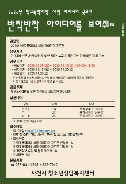 여성가족부 및 사천시에서 지원하고 사천시 청소년육성재단이 운영하는 사천시 청소년상담복지센터는 11월 13일까지 ‘학교폭력예방 사업 아이디어 공모전’을 개최하여 학교폭력 예방 및 근절을 위한 청소년들의 참신한 아이디어를 접수 받는다.
