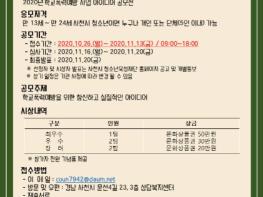 공모는 11월 13일까지 접수받고 있으며, 아이디어들은 심사를 통해 11월 20일 사천시 청소년육성재단 홈페이지에 발표될 예정이다. 시상규모는 최우수 1팀, 우수 2팀, 장려 2팀을 수상자로 선발한다.