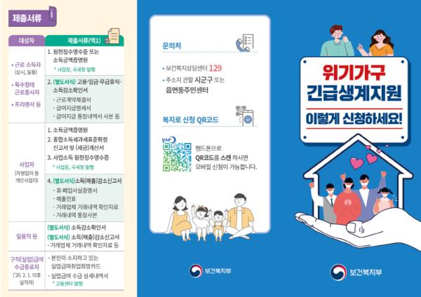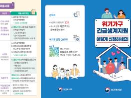 위기가구 긴급생계지원은 코로나19로 인한 실직?휴폐업 등으로 소득이 감소하여 생계가 곤란한 가구를 대상으로, 소득 감소여부 및 소득?재산, 기존복지제도 및 타 코로나19 피해지원 프로그램 중복 여부 등을 조사한 후 11월부터 12월까지 가구원수에 따라 1인 40만원, 2인 60만원, 3인 80만원, 4인이상 100만원을 현금으로 1회에 한해 신청한 계좌로 지급한다.